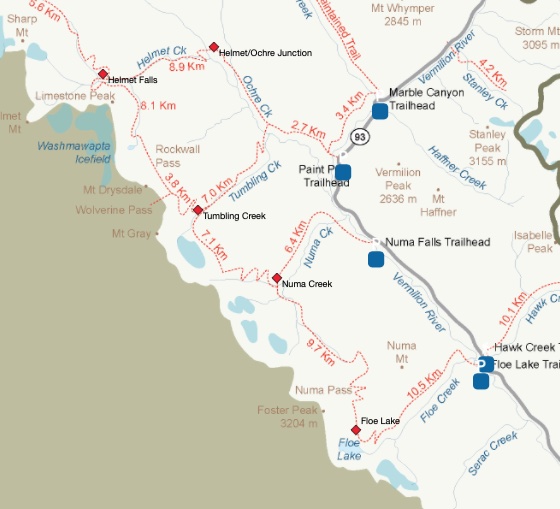 Trail map Helmet Falls <–> Floe Lake