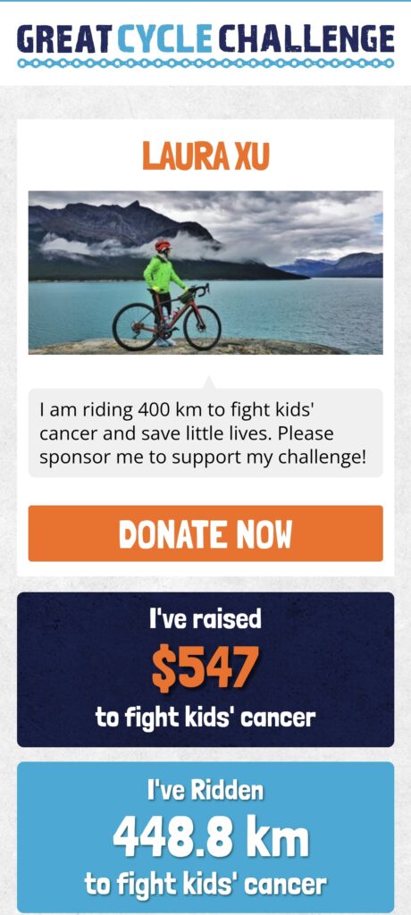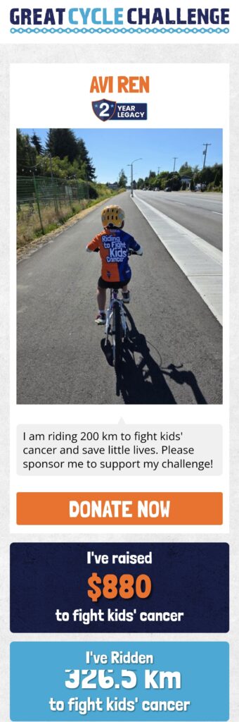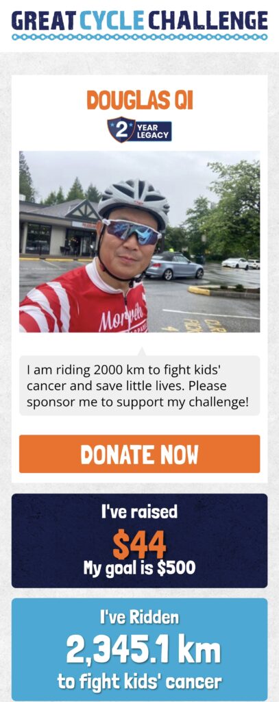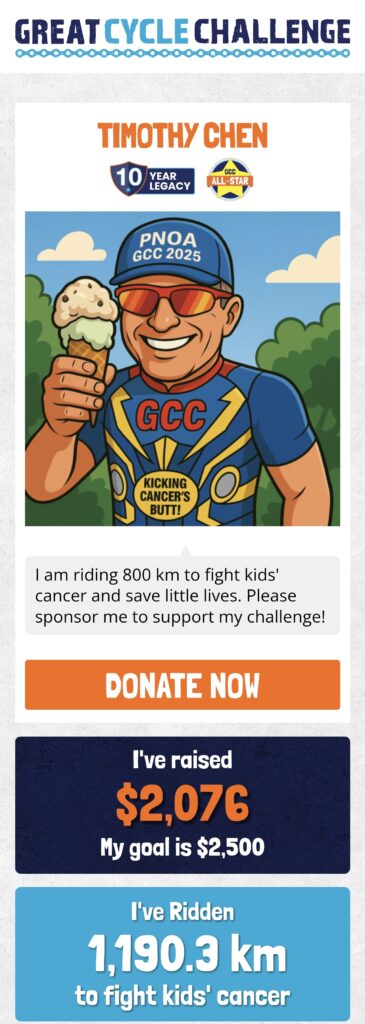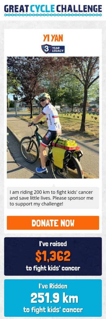 We also celebrated heartwarming moments like the Garron family’s matched donations on Kick Cancer’s Butt Day, boosting totals for riders like Timothy Chen ($578.41), Yi Yan ($533.83), and Zoe Ren ($345.92). Encouraging notes from supporters, such as “Pedal to the metal 🚵♀️” and “Good job on cycling and helping sick children,” kept our spirits high.